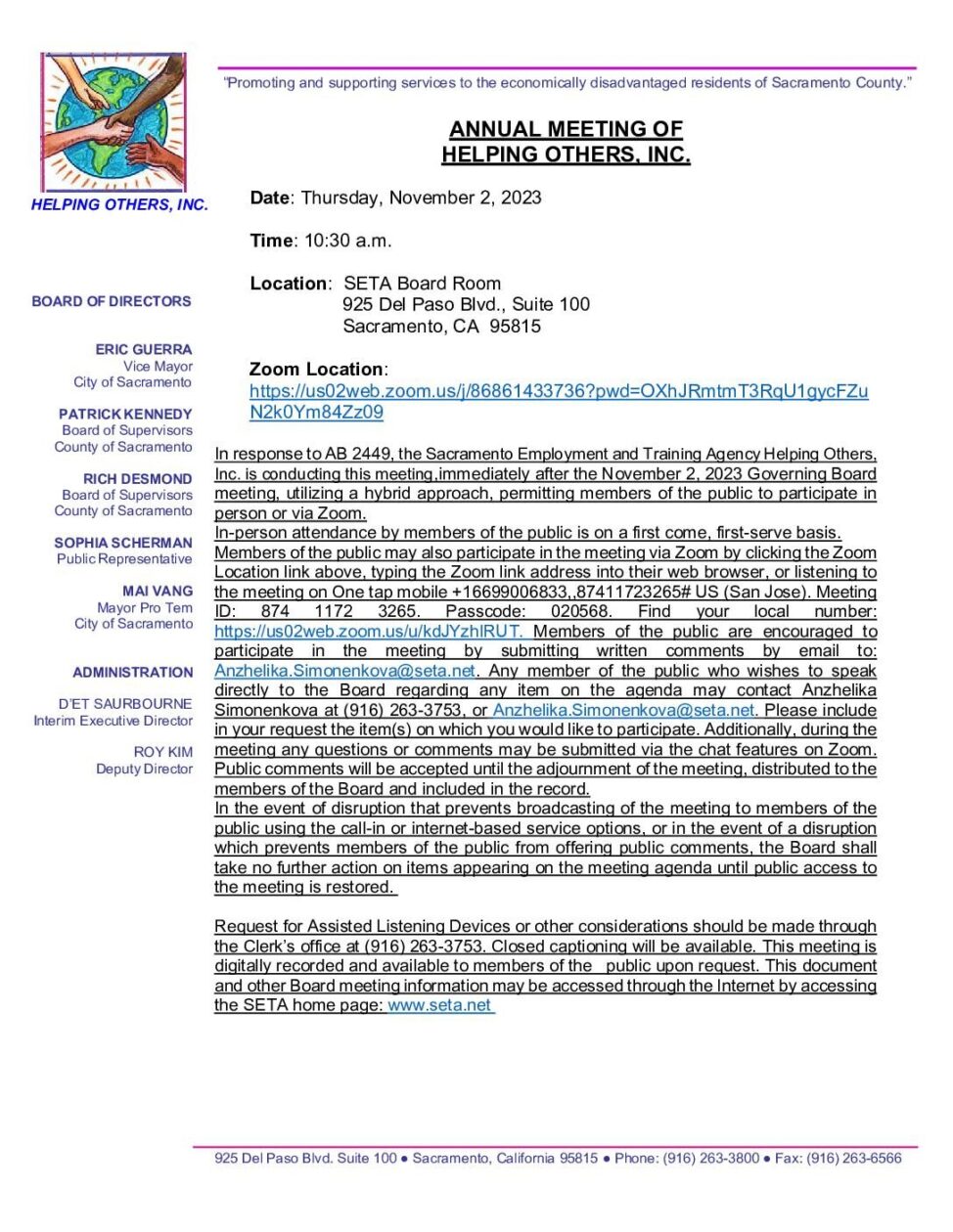 Annual Meeting of Helping Others, Inc. 11/02/2023