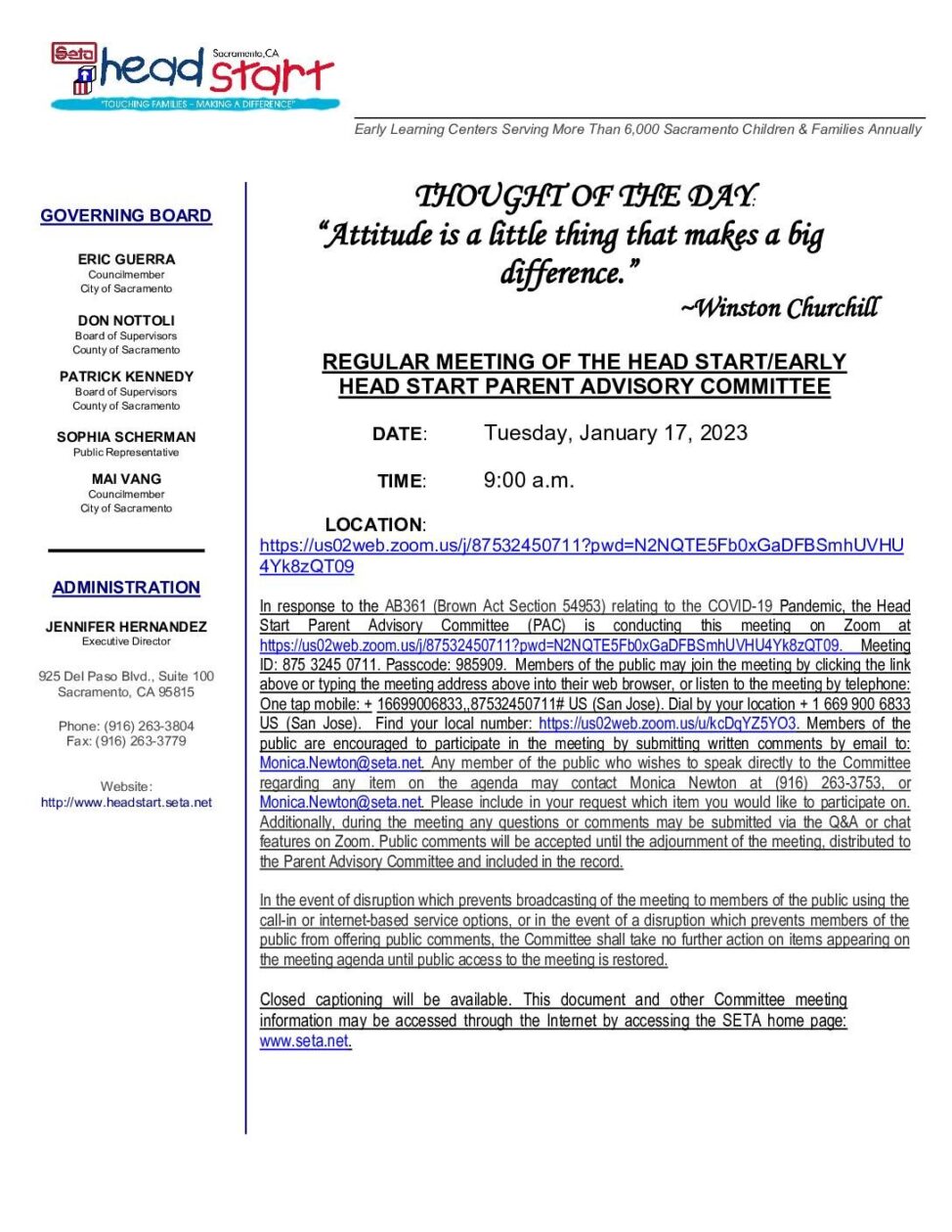 Head Start/Early Head Start Parent Advisory Committee 01/17/2023