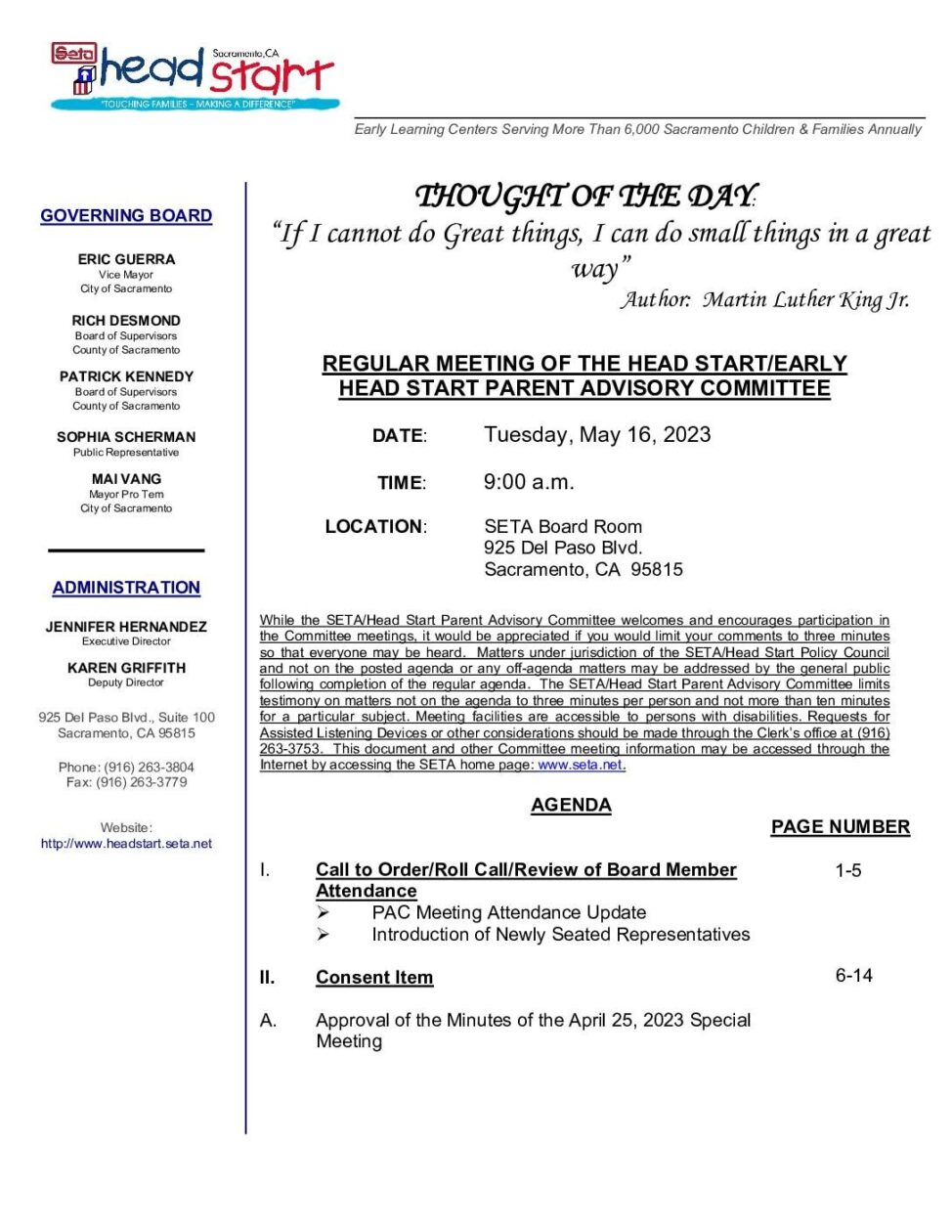 Head Start/Early Head Start Parent Advisory Committee 05/16/2023