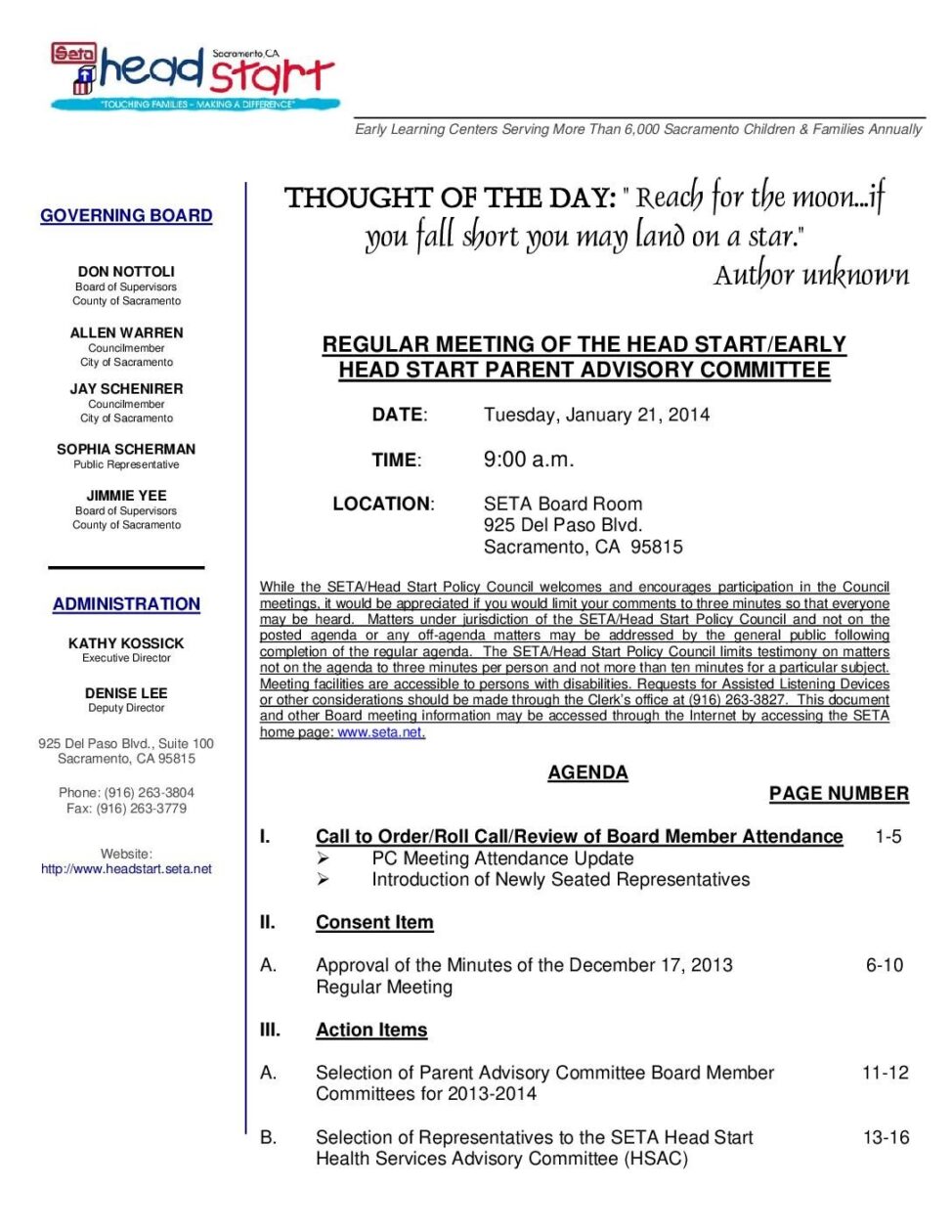 Head Start/Early Head Start Parent Advisory Committee 1/21/14