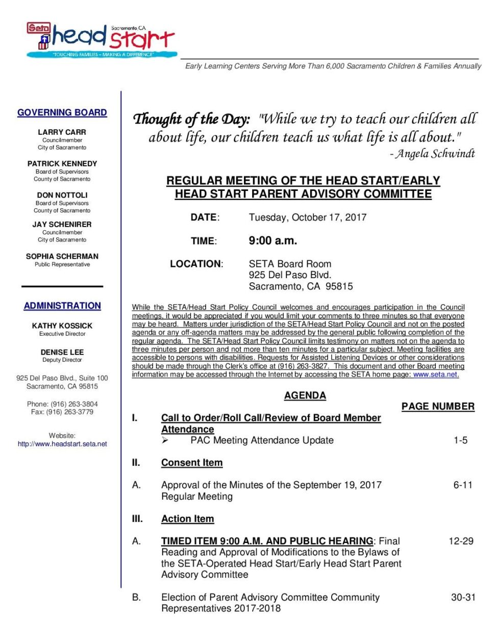 Head Start/Early Head Start Parent Advisory Committee 10/17/17