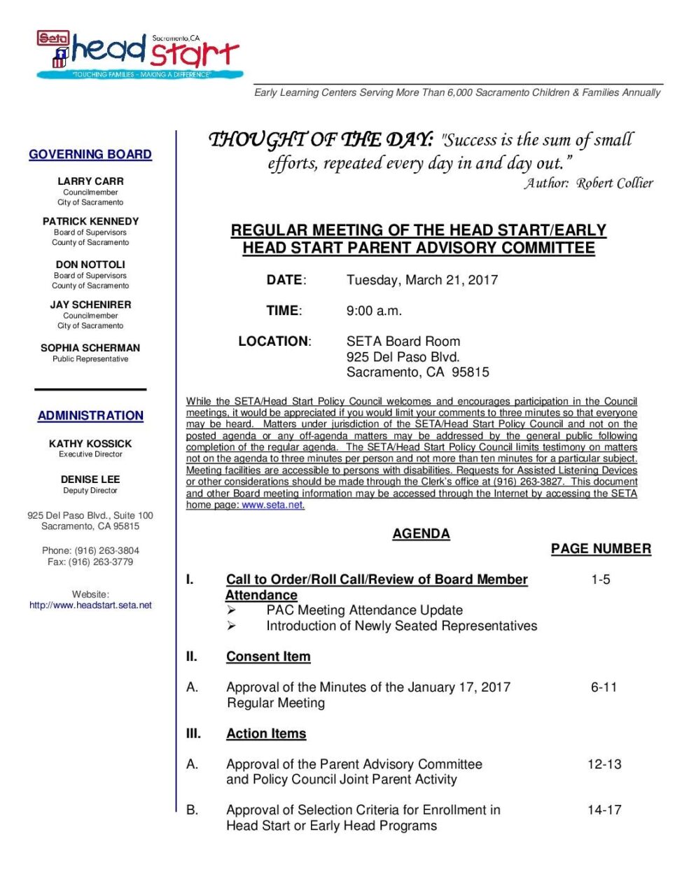 Head Start/Early Head Start Parent Advisory Committee 3/21/17
