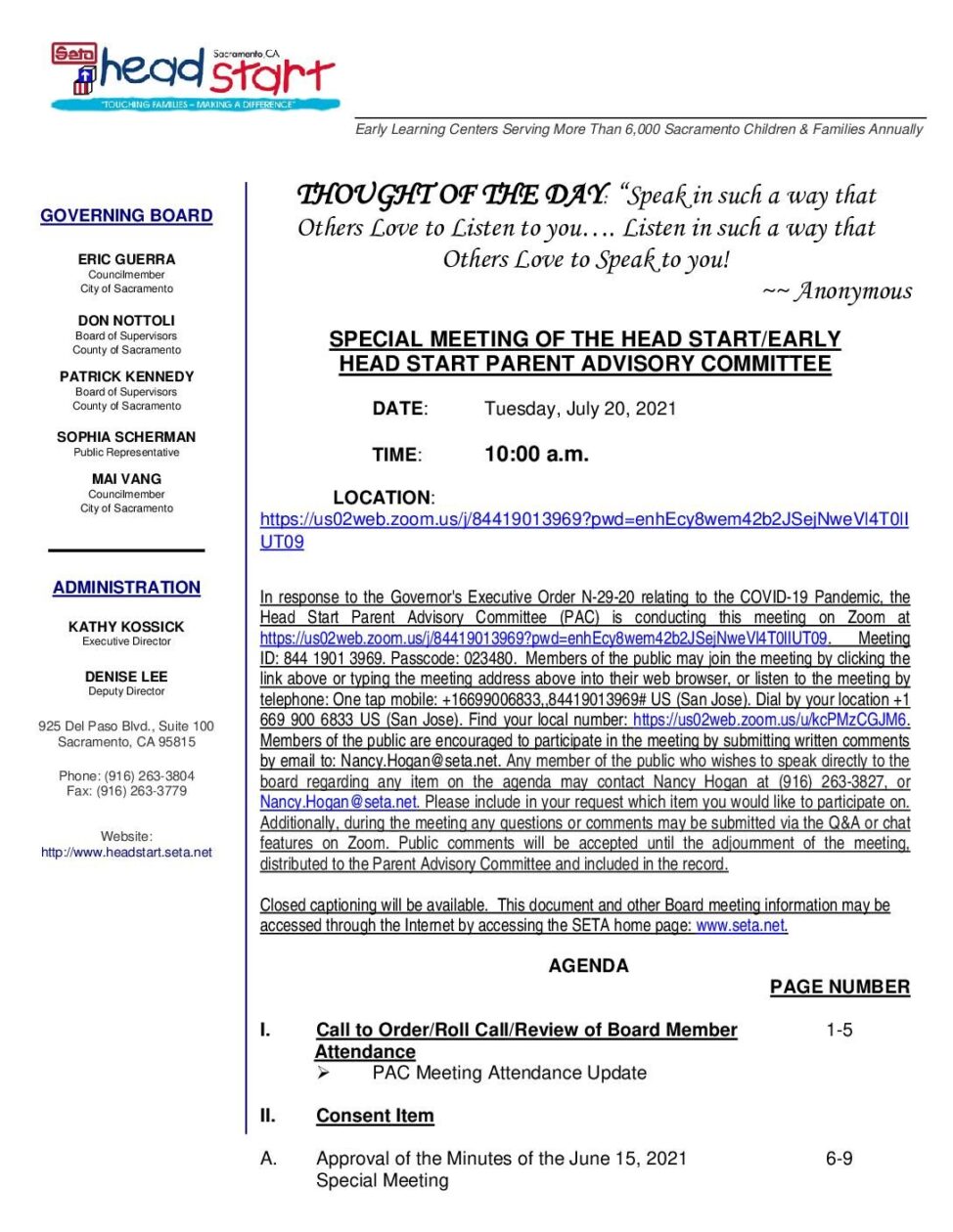 Head Start/Early Head Start Parent Advisory Committee 7/20/2021