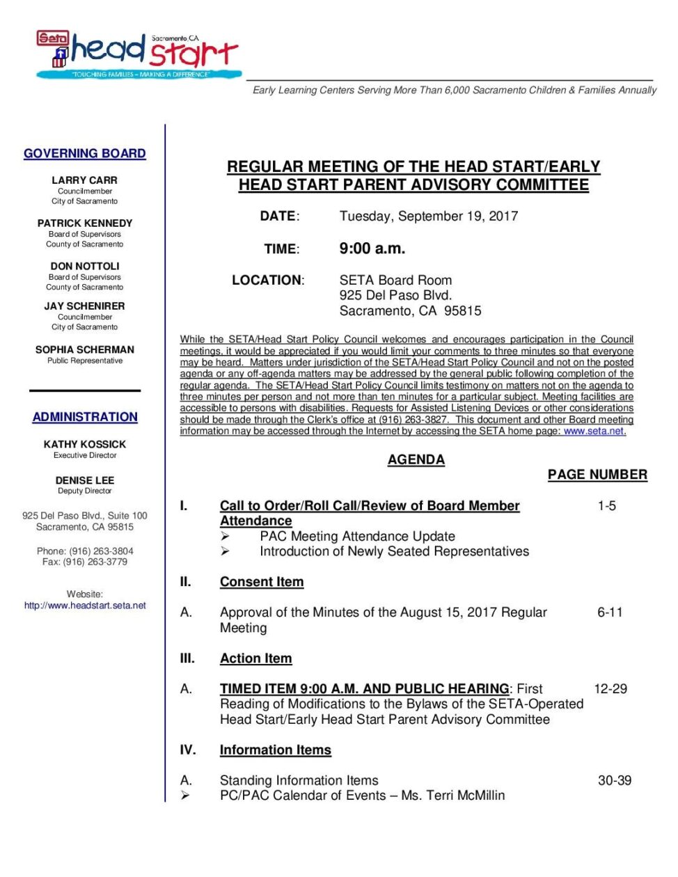 Head Start/Early Head Start Parent Advisory Committee 9/19/17