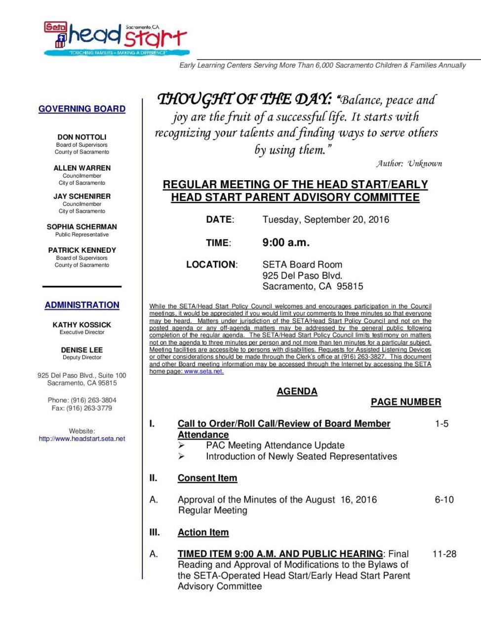Head Start/Early Head Start Parent Advisory Committee 9/20/16