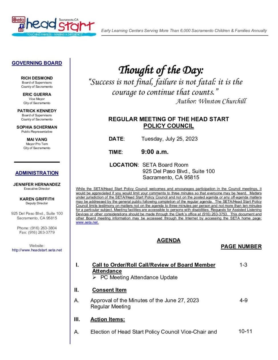 Board Agendas, Head Start Policy Council