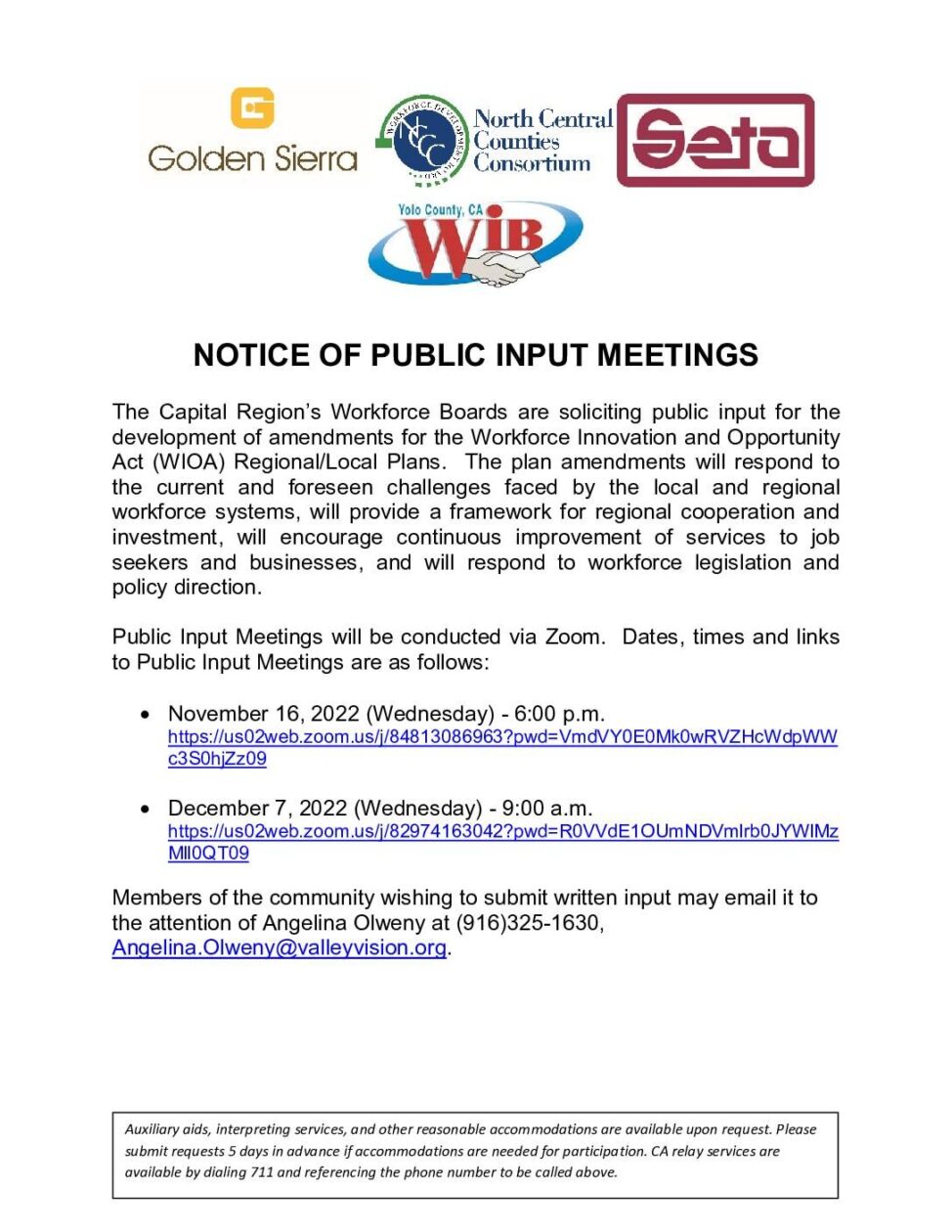 Public Notice – Input Meetings for Regional and Local Workforce Development Plan Updates