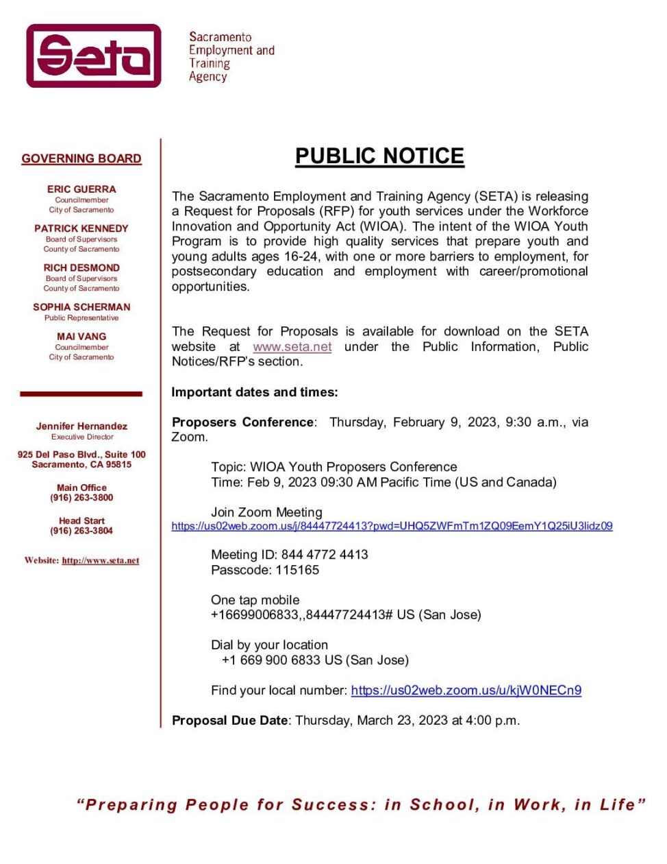 Public Notice of Release of Proposals for WIOA Youth Program Services 2023/2027