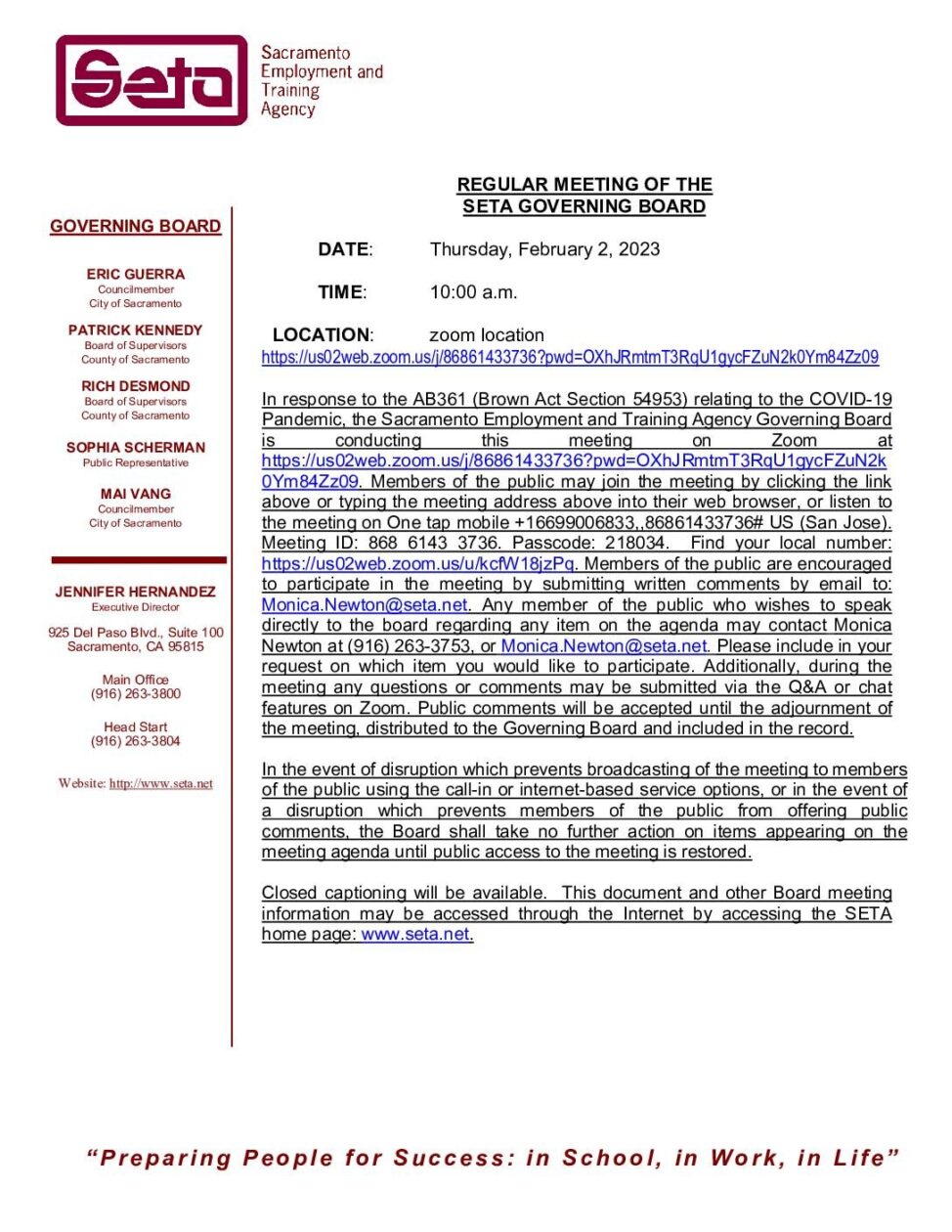 Regular Meeting of the SETA Governing Board 02/02/2023