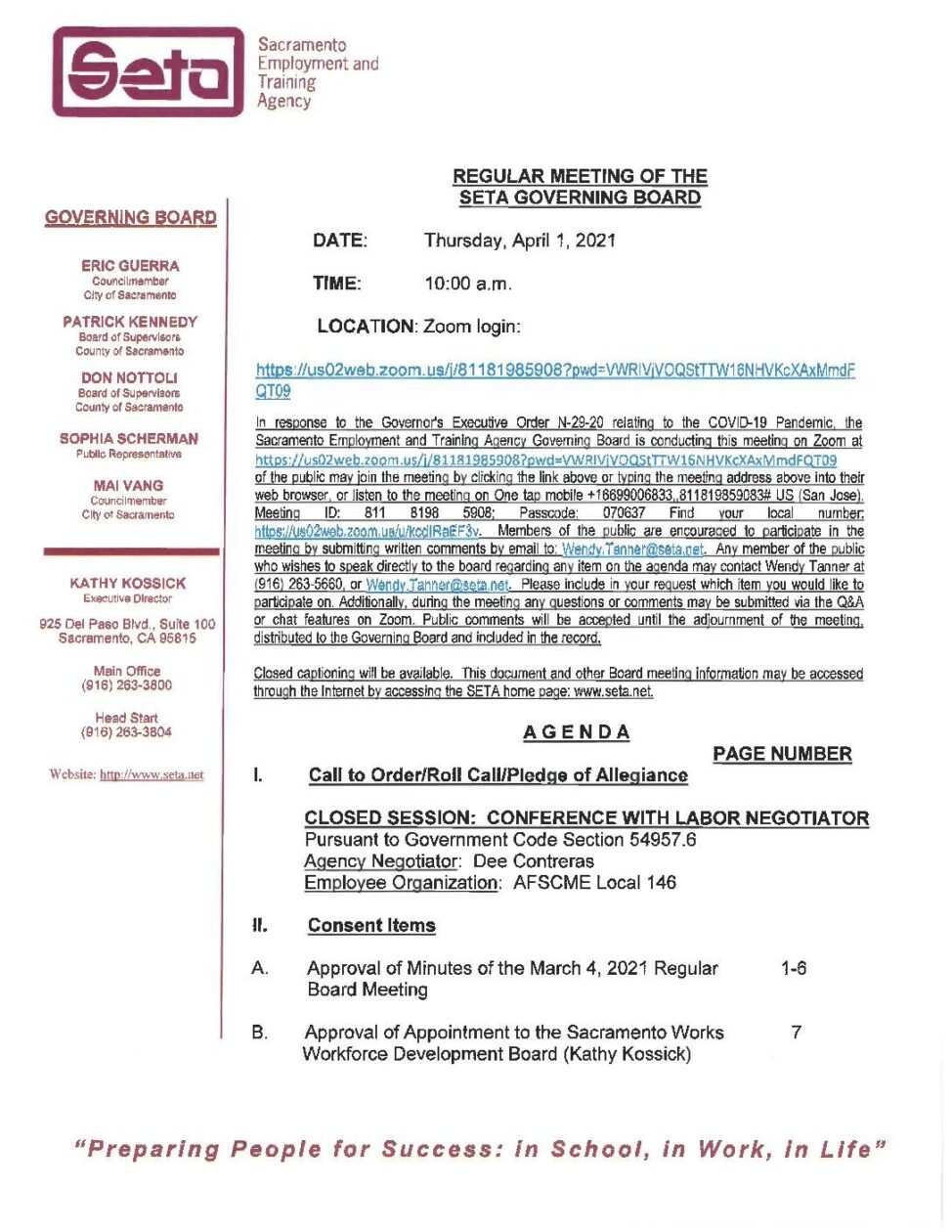 Regular Meeting of the SETA Governing Board 4/01/2021