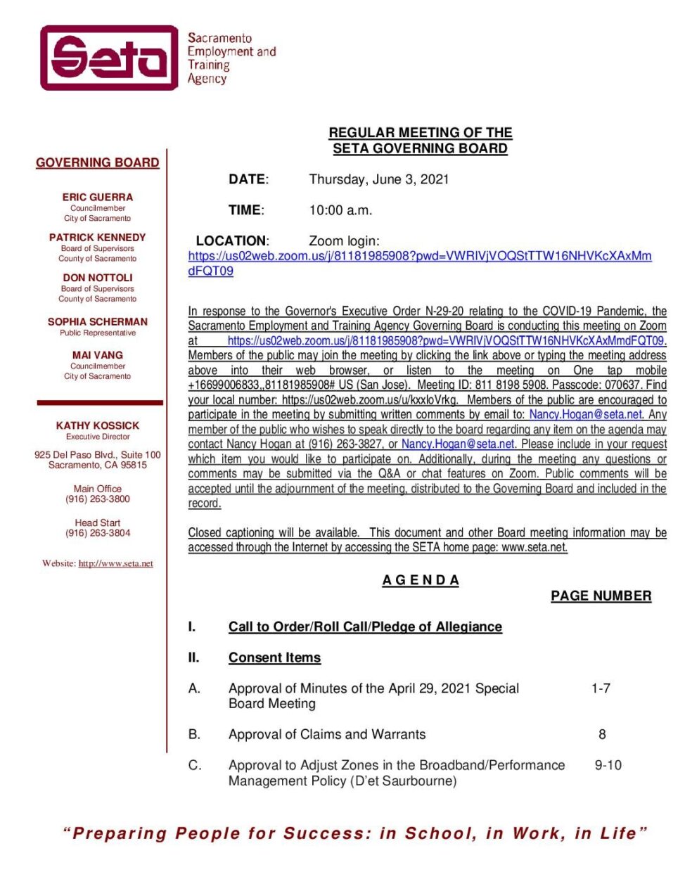 Regular Meeting of the SETA Governing Board 6/3/2021