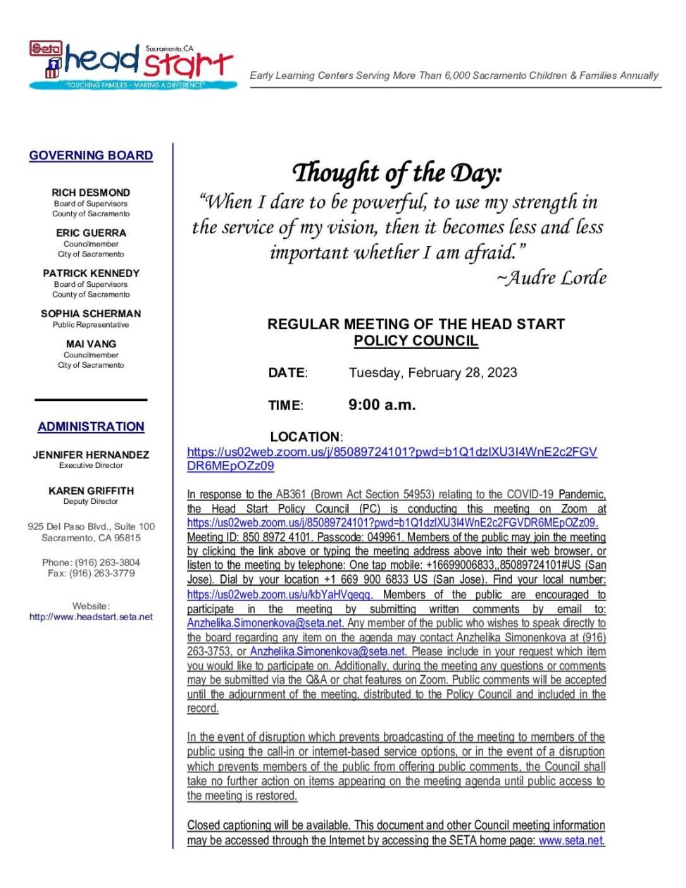 Revised Agenda / Head Start/Early Head Start Policy Council 02/28/2023