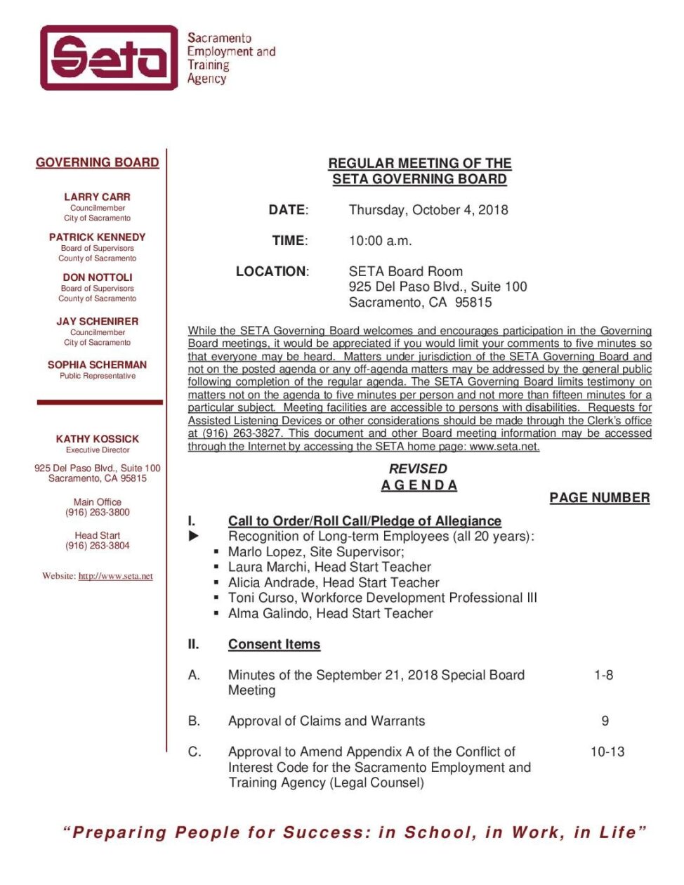 Revised Agenda/Regular SETA Governing Board 10/4/18