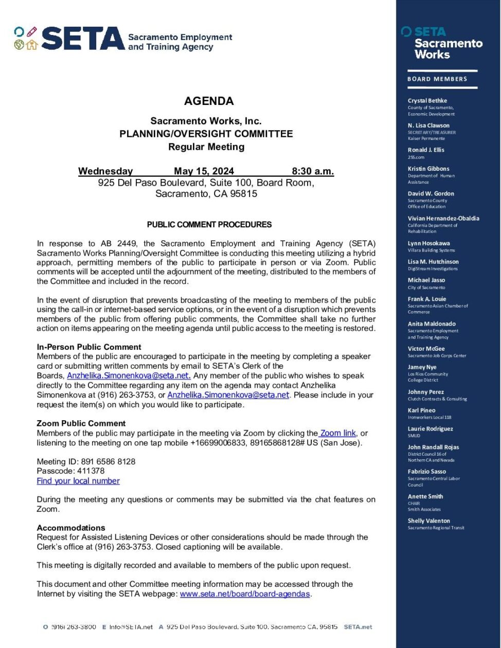 Sacramento Works Planning/Oversight Committee 05/15/2024