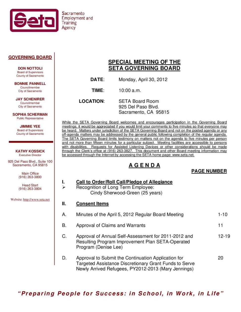 Special Meeting of the Governing Board Agenda for 4/30/12