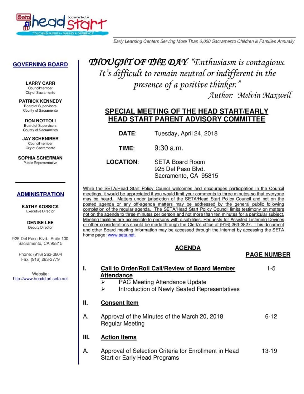 Special Meeting of the Head Start/Early Head Start Parent Advisory Committee 4/24/18