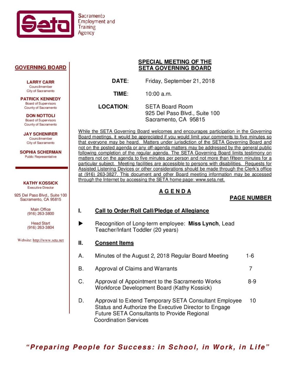 Special SETA Governing Board 9/21/18